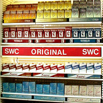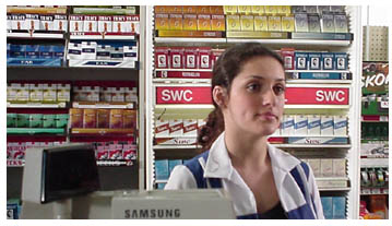 loading the cigarette display with her many invented brands. We