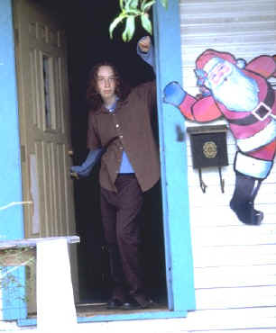 on the sidewalk with the empty lawn beyond him. A half second later,